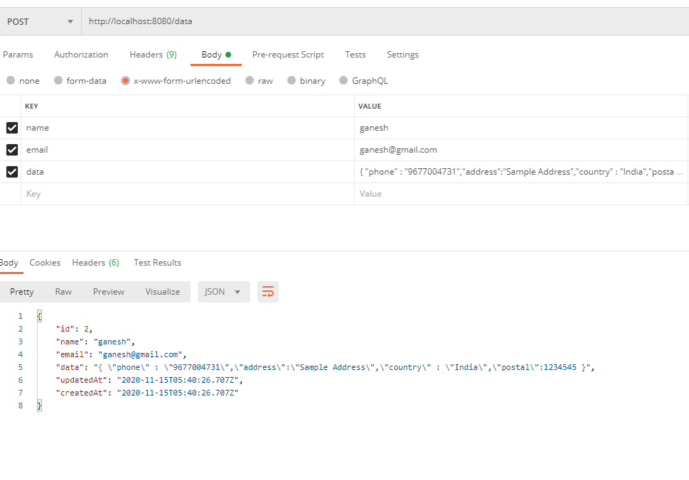 it contains the data in JSON structure which has fields such as phone, address, country, and postal code.