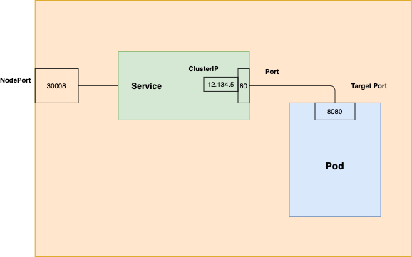 On the above diagram, we need to access the pod from external IP. to do that, we configure Service which maps the port between Pod and NodePort.