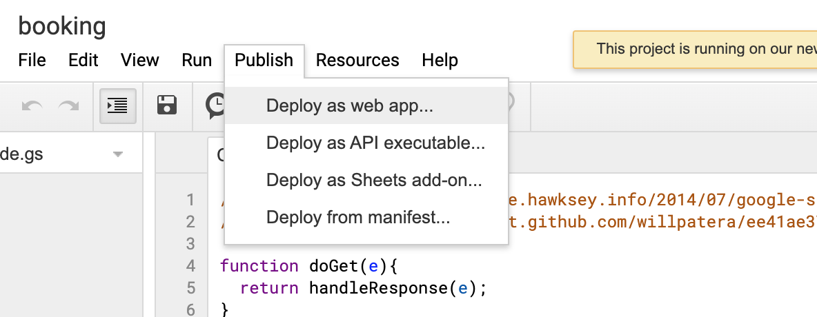 After that, save the script, run the function setup from the script and deploy it as web app by clicking the Publish tab.