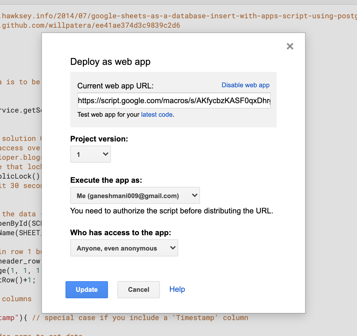 Once you click the Deploy, you need make sure that you configure it correctly. select the Execute the app as → Me and Access Level as Anyone