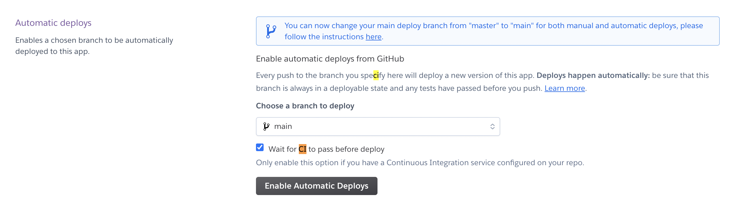 Once you create an application in Heroku, Go to settings ⇒ Connect to Github and select the repository. Make sure to select Wait for CI to pass before deploy. It’s important because we are deploying the application to the production environment.