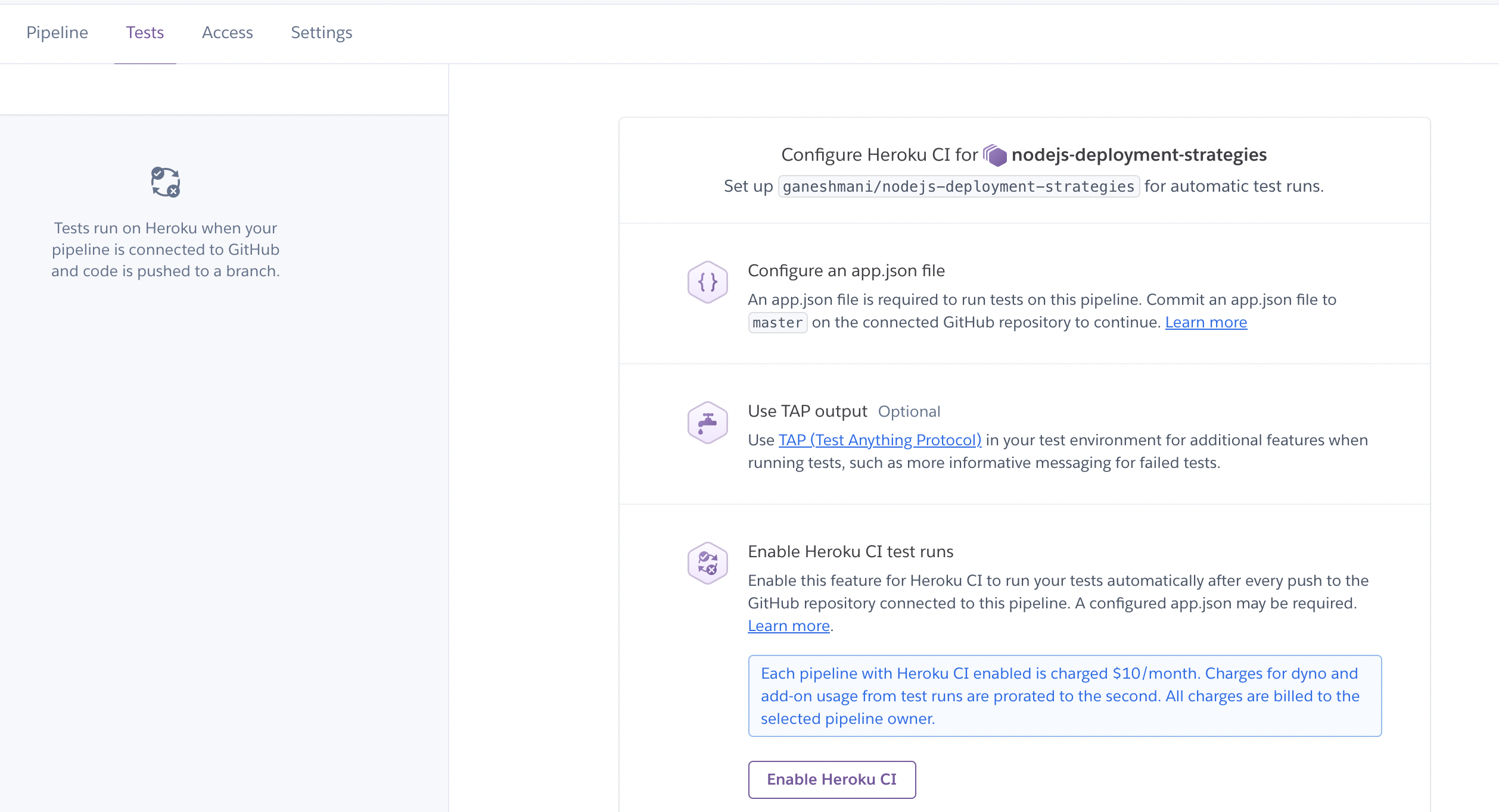 Once you connect the GitHub Repository, you need to configure app.json to run tests on this pipeline. It configures whether we need any add-ons such as test databases or caching for test suits. You need to configure them. Also, make sure you enable Heroku CI.
