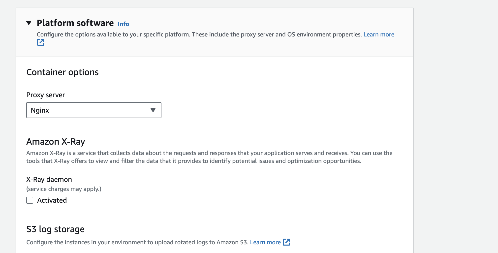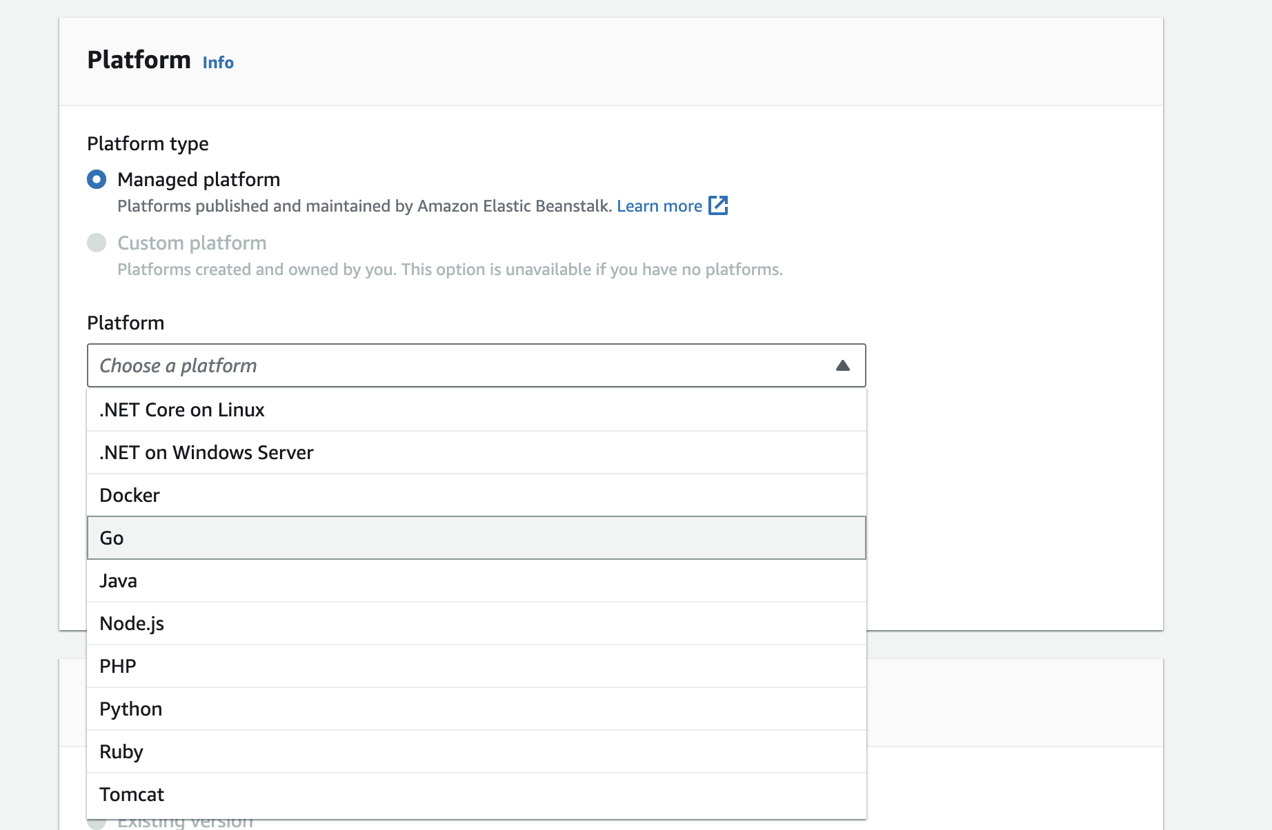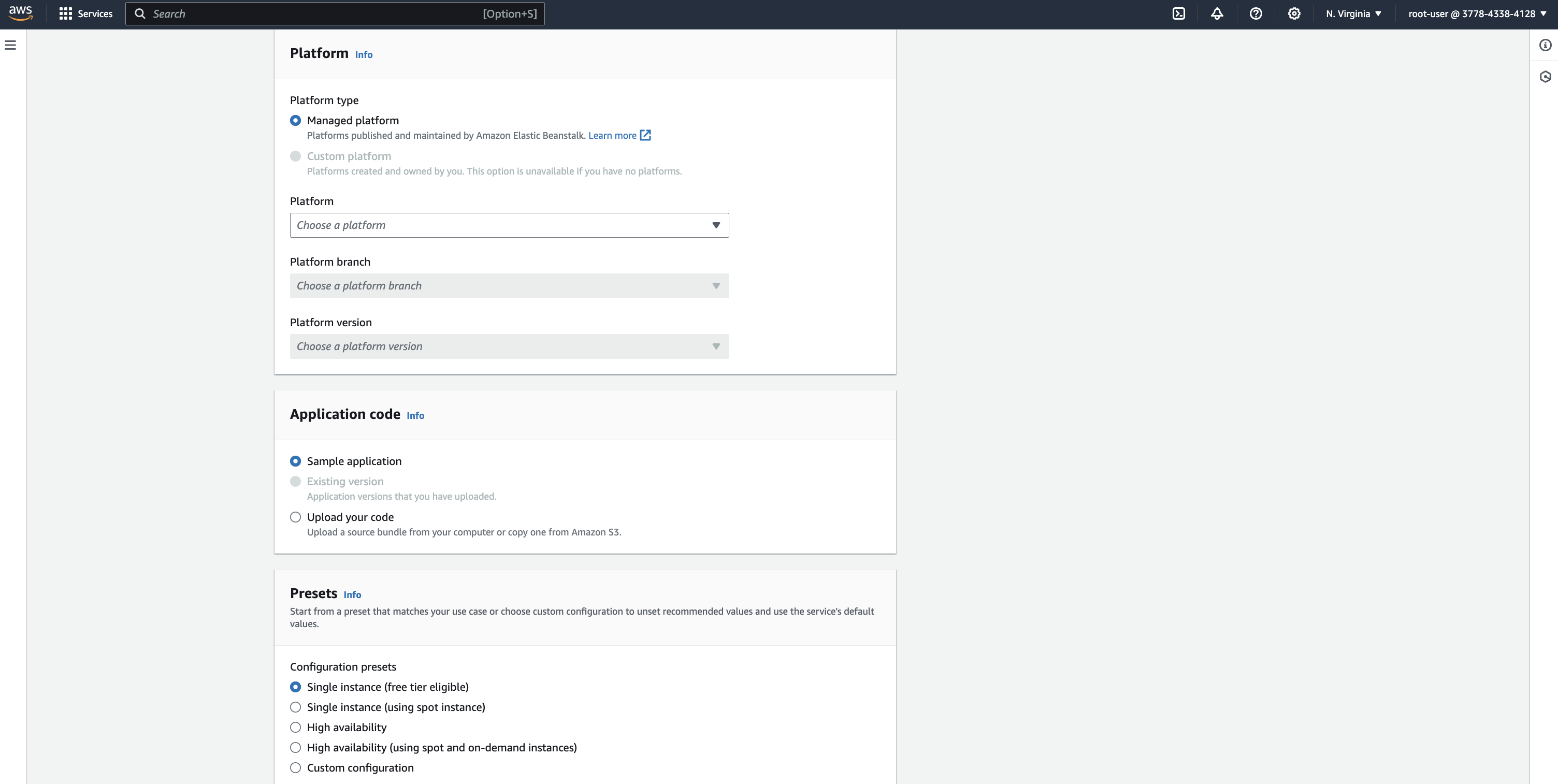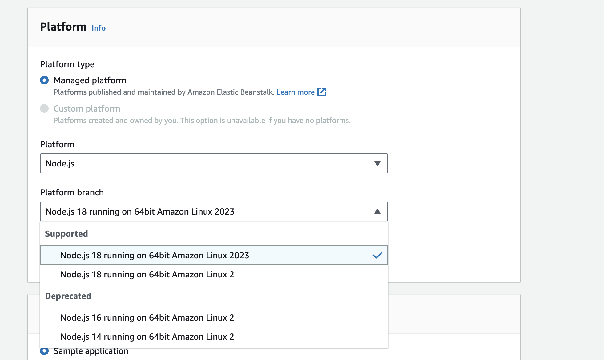 One of the important configurations is selecting the platform type. We will be using a managed platform as Elastic Beanstalk automatically handles the environment and its configurations.