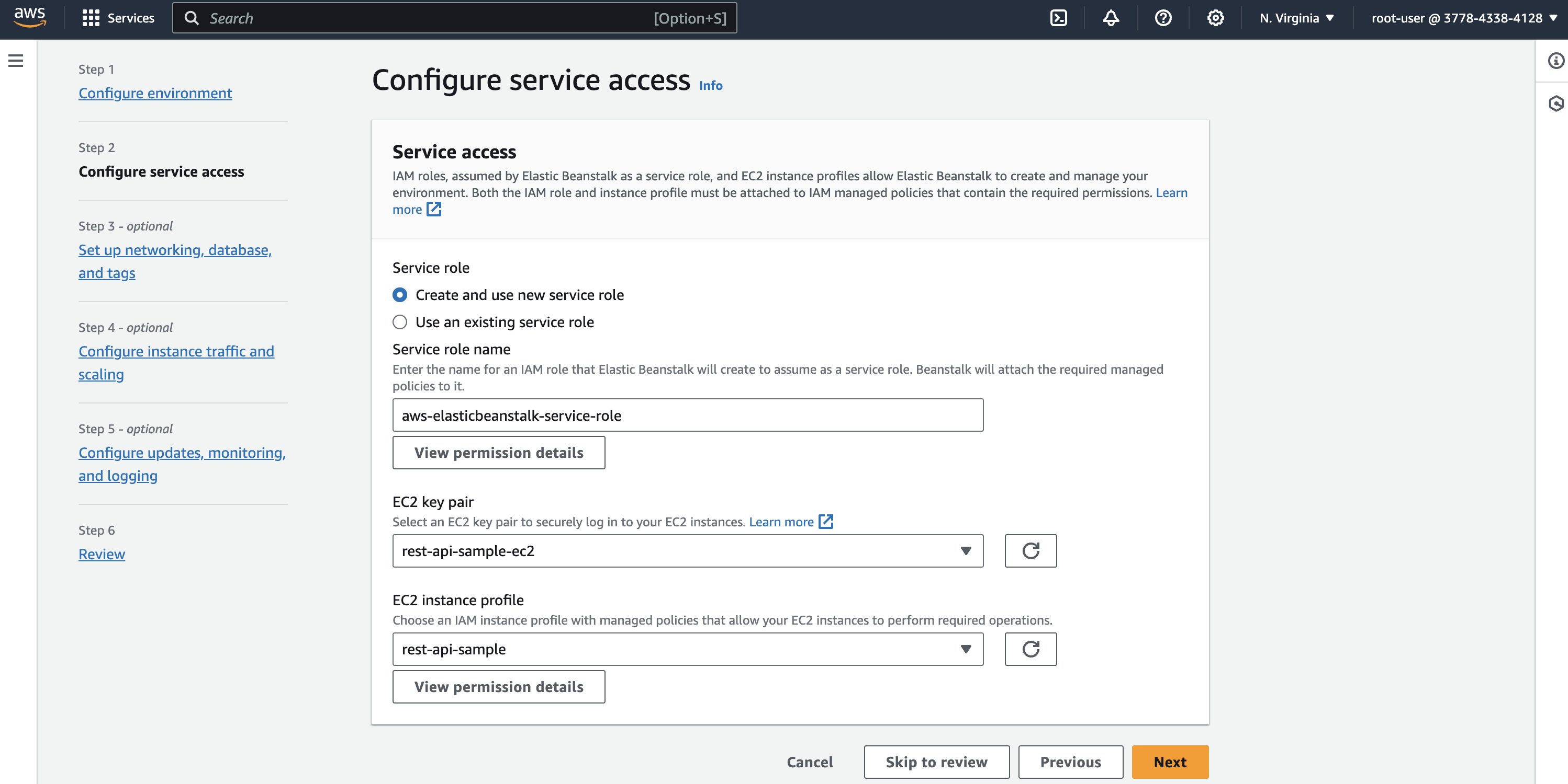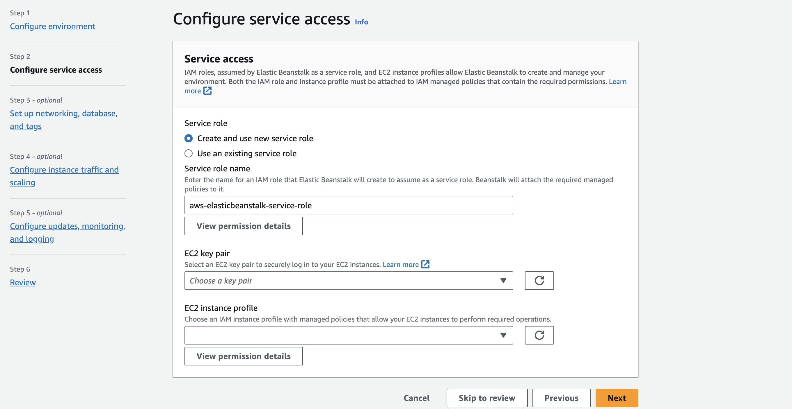 To configure service access, we need EC2 Key pair and EC2 instance profile that allow Elastic Beanstalk to provision EC2 instance. EC2 instance profile is nothing but an IAM Role that allow AWS services to access resources.