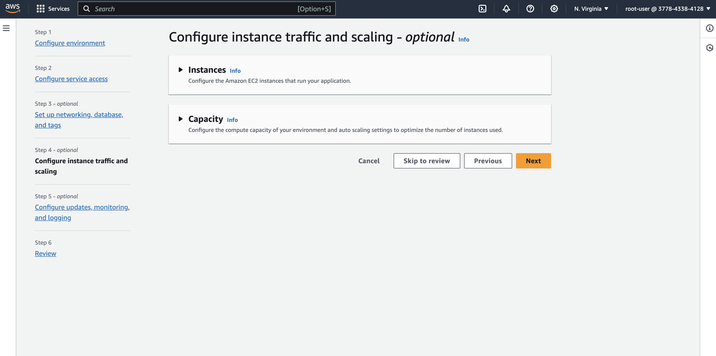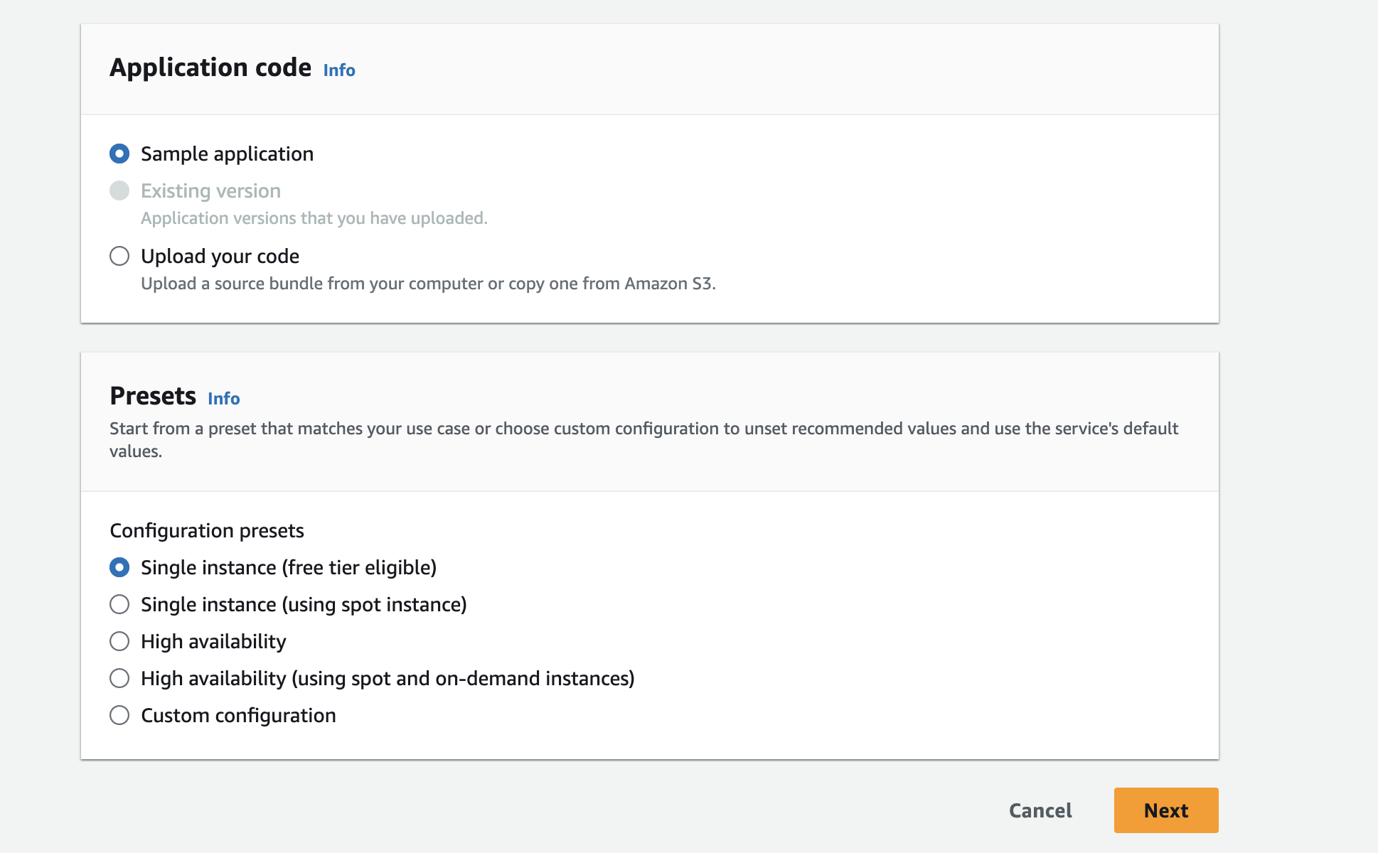 Another important configuration is choosing instance type for the application. It provides Single instance and multiple instances. We can choose single instance using spot instance or multiple instances using spot and on-demand instances.