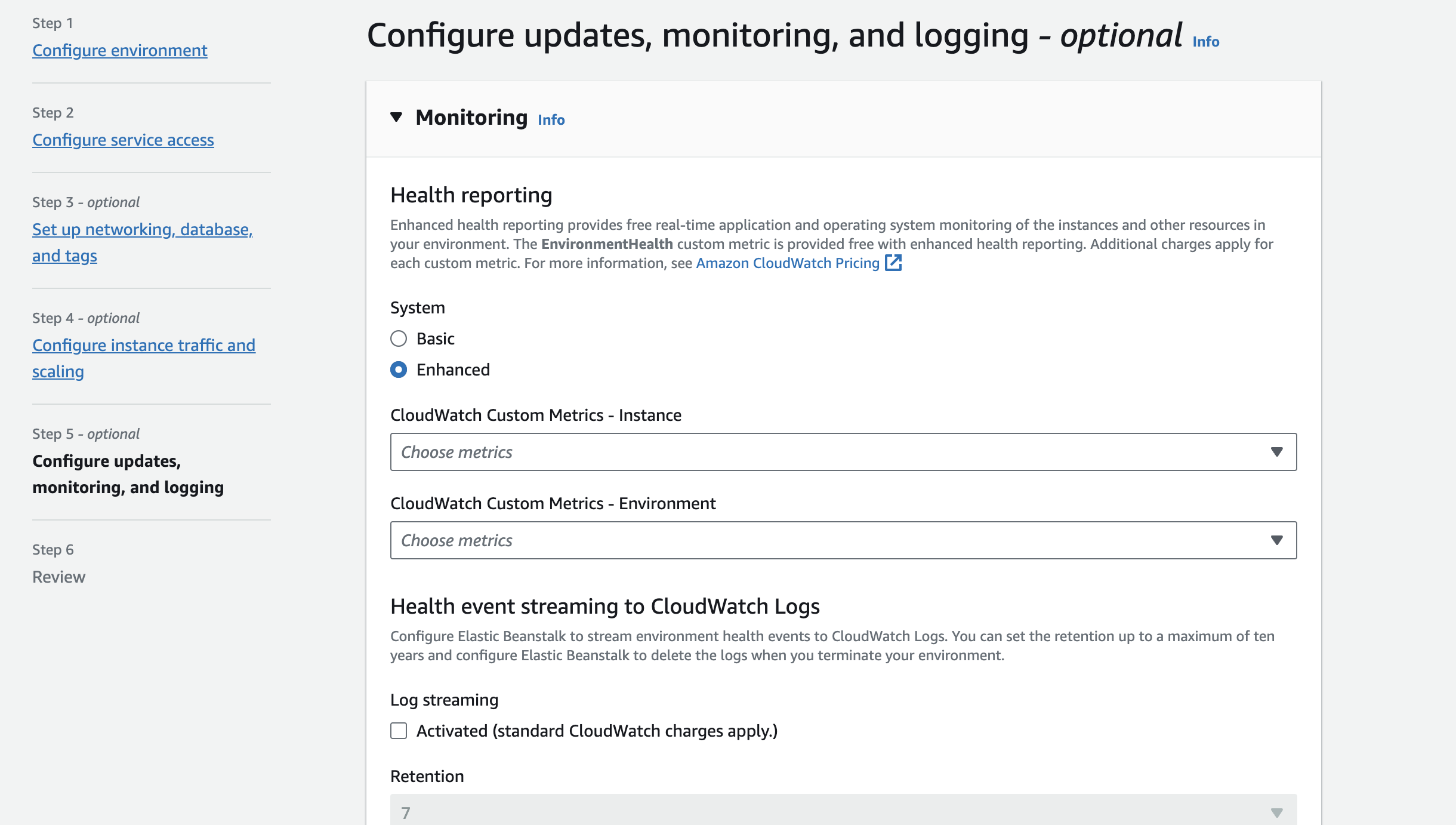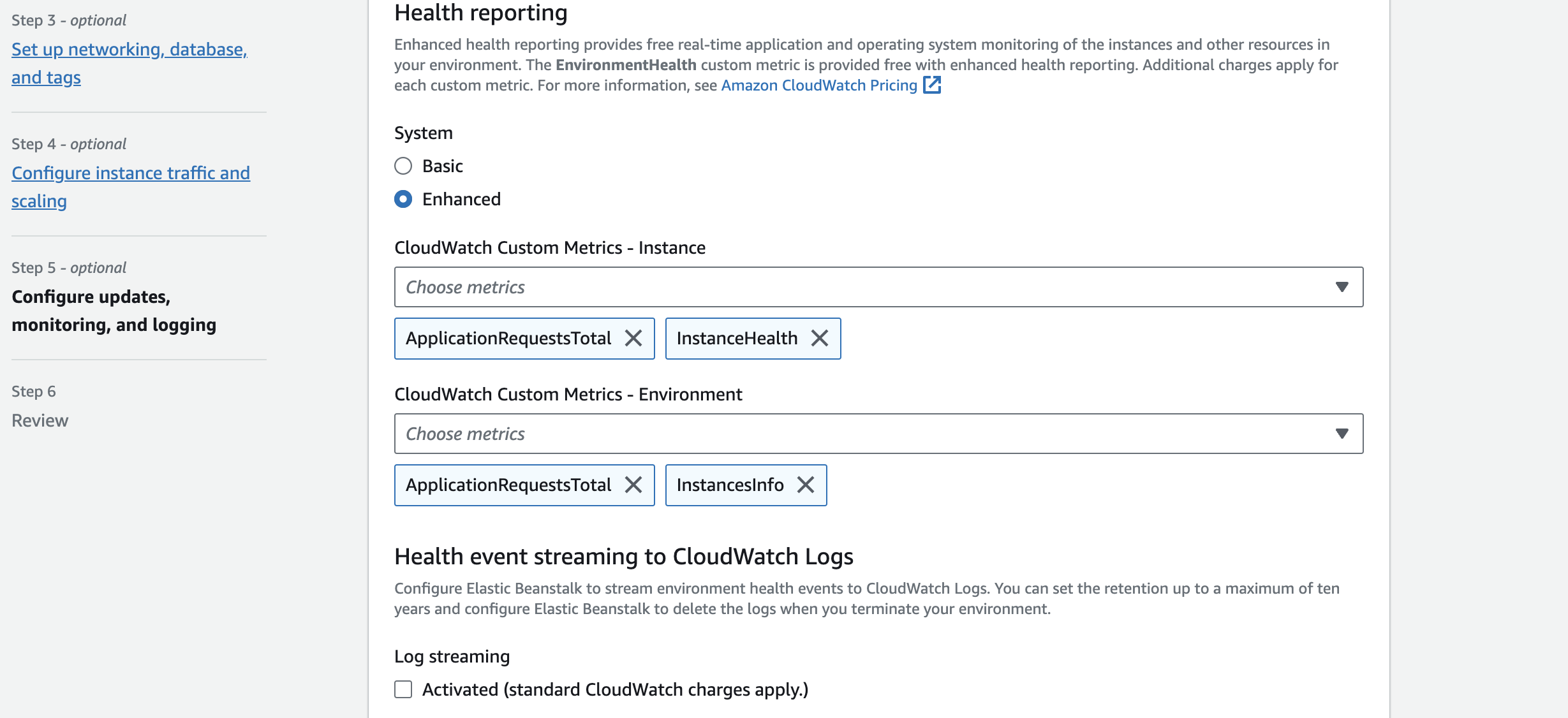 We are going to use default instance configuration move into the final configuration which is configuring monitoring and logging. Elastic Beanstalk attach cloudwatch by default to log different metrics of an environment. It select Enhanced health reporting by default and you can select different kind of metric of an instance to monitor.