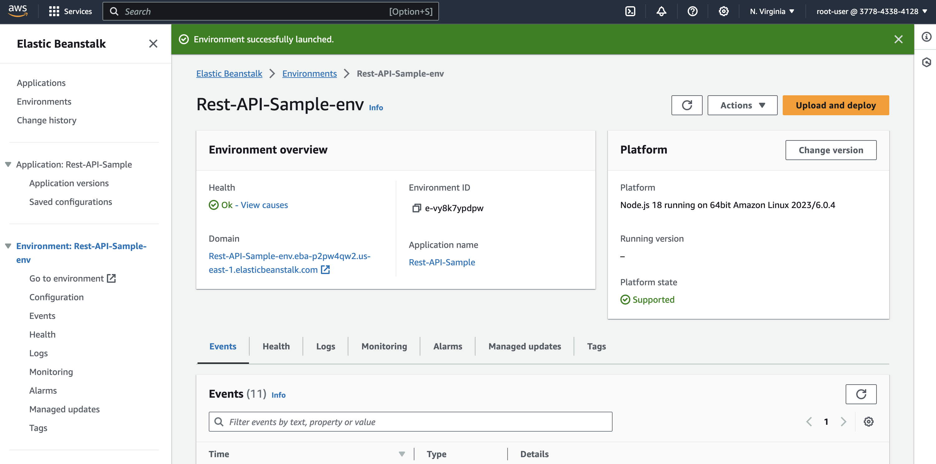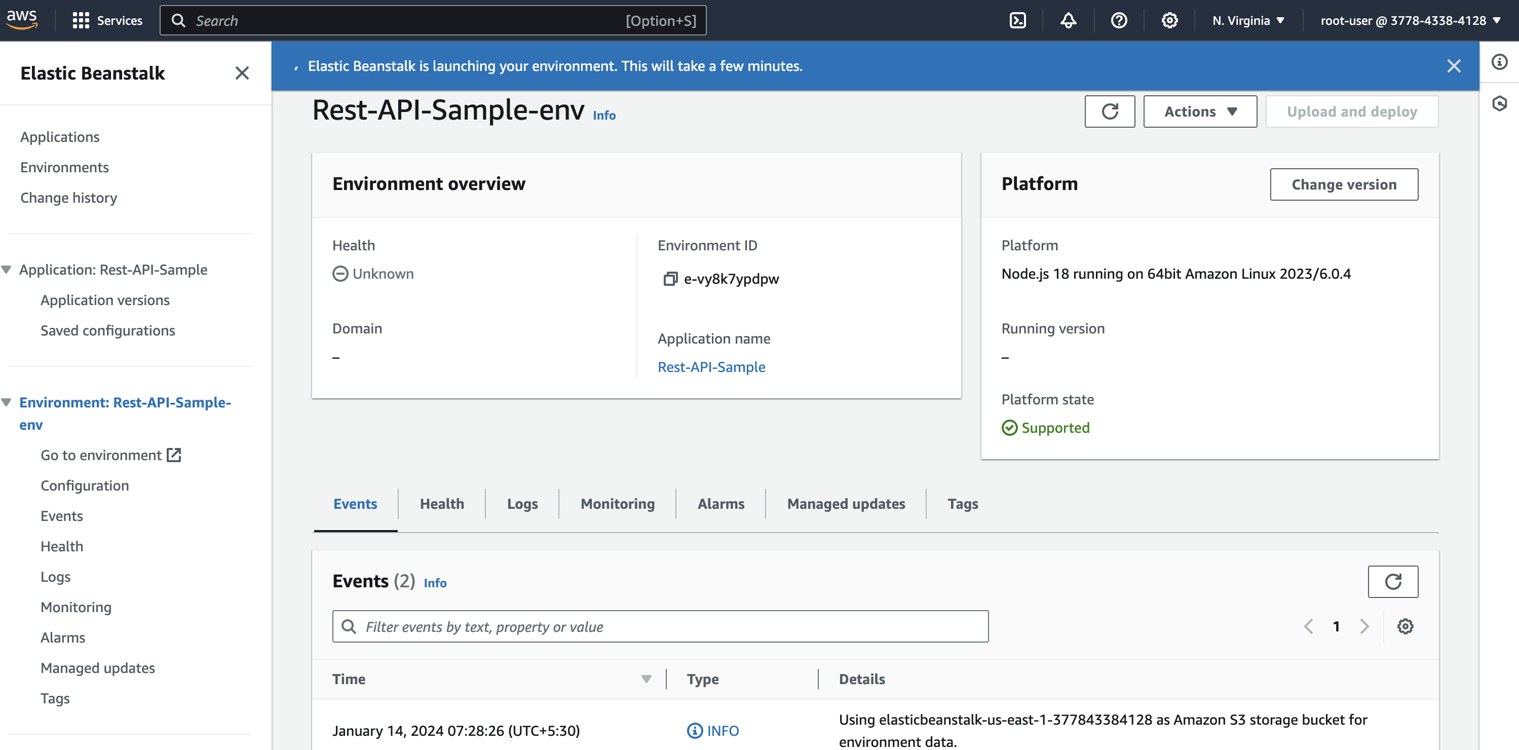 Once you configure it all, review all the configuration that we’ve done and click on submit. After submitting it and if all configured correctly, you can see a notification says that Elastic Beanstalk is launching the environment.